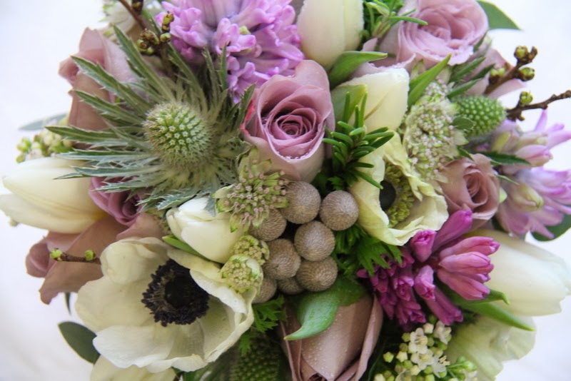 Pink Suede Trial Bridal Bouquet created for one of our Spring Brides including Hyacinths, Memory Lane and Amnesia Roses, Tulips, Anemones, Astrantia, Erynhium, Blossom, Rosemary, Albiflora and Eucalyptus
